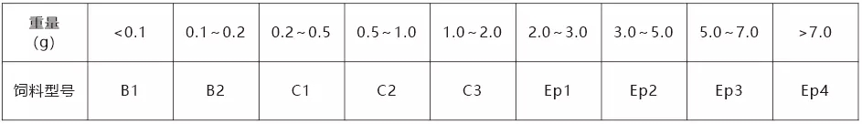 飼料適口性對(duì)石斑魚(yú)攝食及采食量產(chǎn)生很大影響,而飼料顆粒大小占飼料適口性很大一部分,在不同體重下對(duì)應(yīng)飼料規(guī)格見(jiàn)下表。